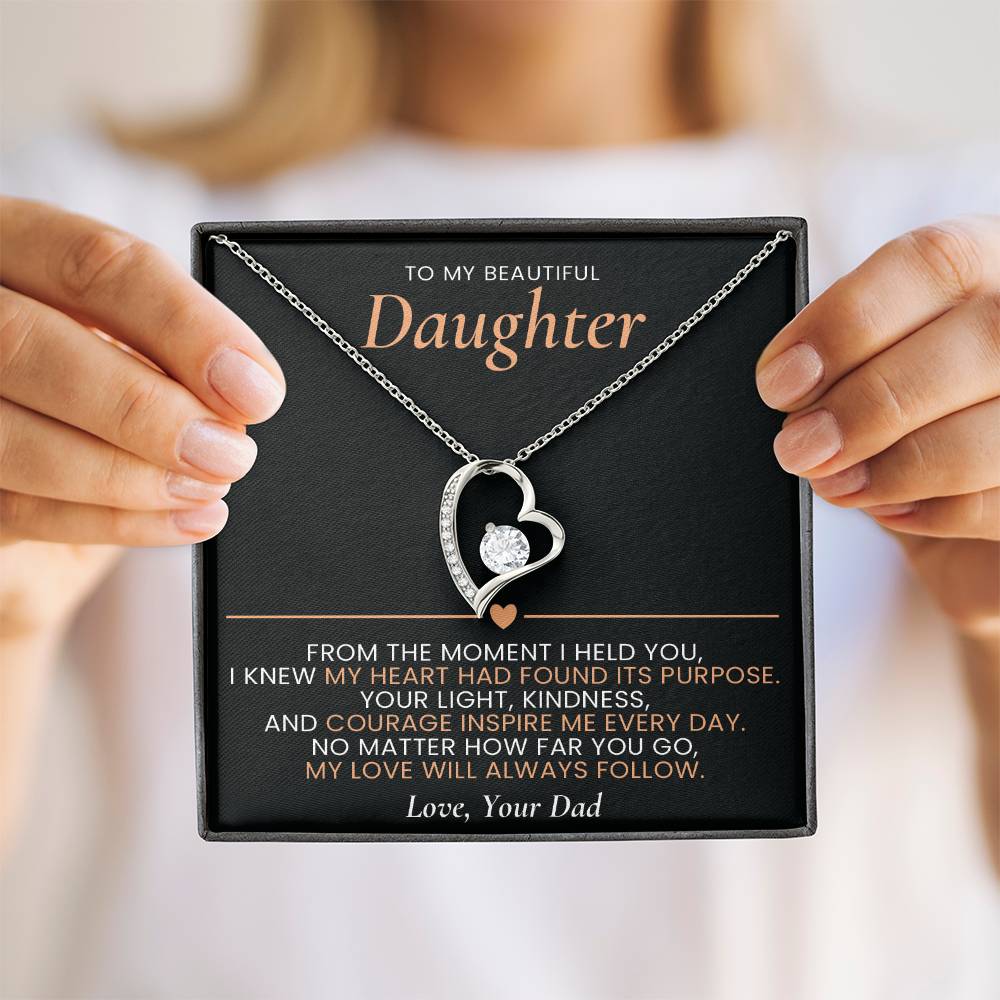 Surprise your daughter with a stunning Forever Love Necklace featuring a delicate heart pendant and an emotional message that speaks directly from your heart. The enclosed message card reads: “From the moment I held you, I knew my heart had found its purpose. Your light, kindness, and courage inspire me every day. No matter how far you go, my love will always follow.” 💗